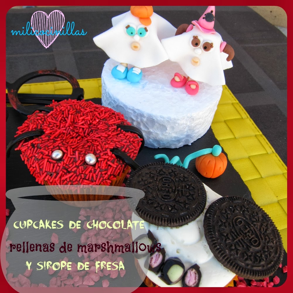 Esta vez las victimas son unas cupcakes de chocolate (Increíblemente deliciosas, super húmedas, esponjosas y jugosas) a las que he añadido (Por ser halloween) unos marshmallows y un poco de sirope de fresa y por si con esto no fuera suficiente, vamos a decorar con dos cremas: -Una de chocolate Sin Lactosa y otra de chocolate blanco con Lactosa